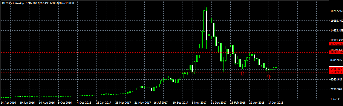 На минувшей неделе биткоин продемонстрировал несколько попыток подняться вверх и сумел достигнуть отметок около $6800. Тем не менее, психологический барьер в $7000 по-прежнему не взят, более того, к утру понедельника наблюдалась небольшая коррекция с откатом до $6700.
