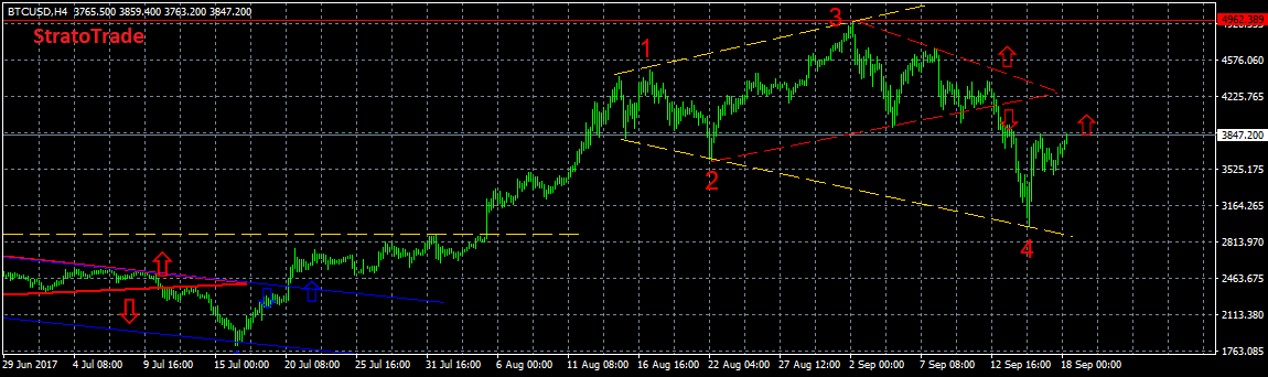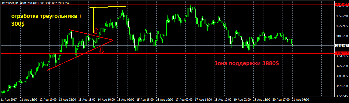 Как и предполагалось в прошлом выпуске аналитики, покупки в районе $4300-4400 оказались довольно опасными, поскольку многие приверженцы торговли на небольших таймфреймах предпочли закрыть свои позиции и после отработки малого треугольника на часовом таймфрейме цена биткоина пошла вниз.