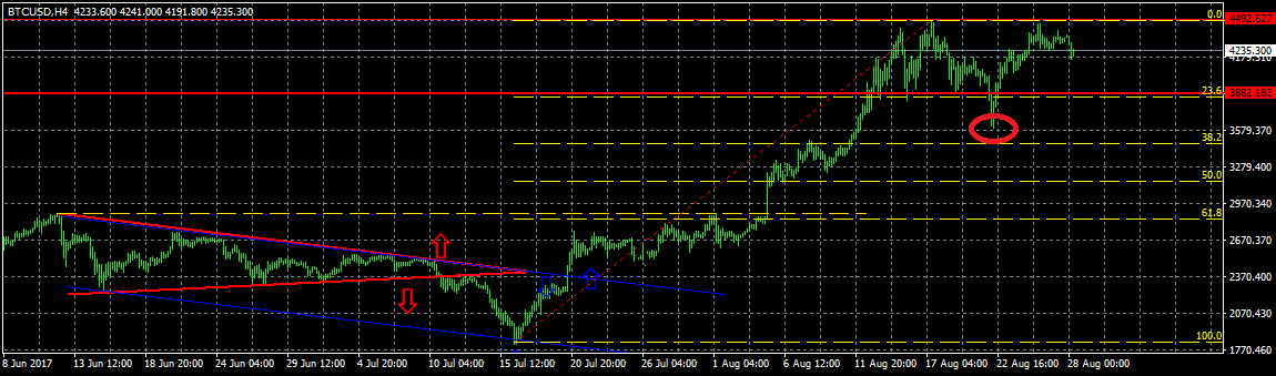 На четырехчасовом графике видна коррекция в район $3600, о вероятности которой речь шла в прошлом обзоре (многие не верили, но это случилось). Самые “быстрые” трейдеры успели закупиться, вовремя откупив коррекцию, я же предполагал более долгое нахождение в том районе. Полагаю, что если случится пробой отметки в $4000, то зону в районе $3600 мы увидим снова.