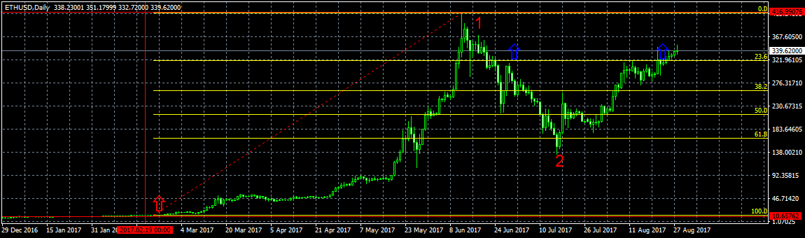 Вторая по капитализации криптовалюта продолжает свое уверенное шествие. В прошлом обзоре предположил, что мы находимся в третьей волне. Уверенности в дальнейшем росте цены придает грядущий осенний хардфорк, под который многие наращивают свои позиции в надежде получить дополнительные бонусы.