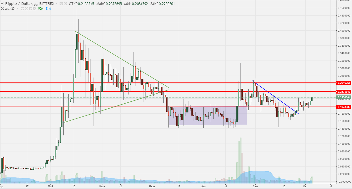 Также есть сомнения, что рост цен основных криптовалют, который происходит в октябре после сильной коррекции в прошлом месяце, можно считать стабильным ростом. По всей вероятности, движения криптовалют вверх, которые наблюдаются последние десять дней, носят просто технический характер, и фундаментально ничем не подкреплены. Поэтому, я считаю, даже в случае прорыва красной линии сопротивления, в ближайший месяц XRP поднимется максимум до предыдущей вершины на уровне $0,28.