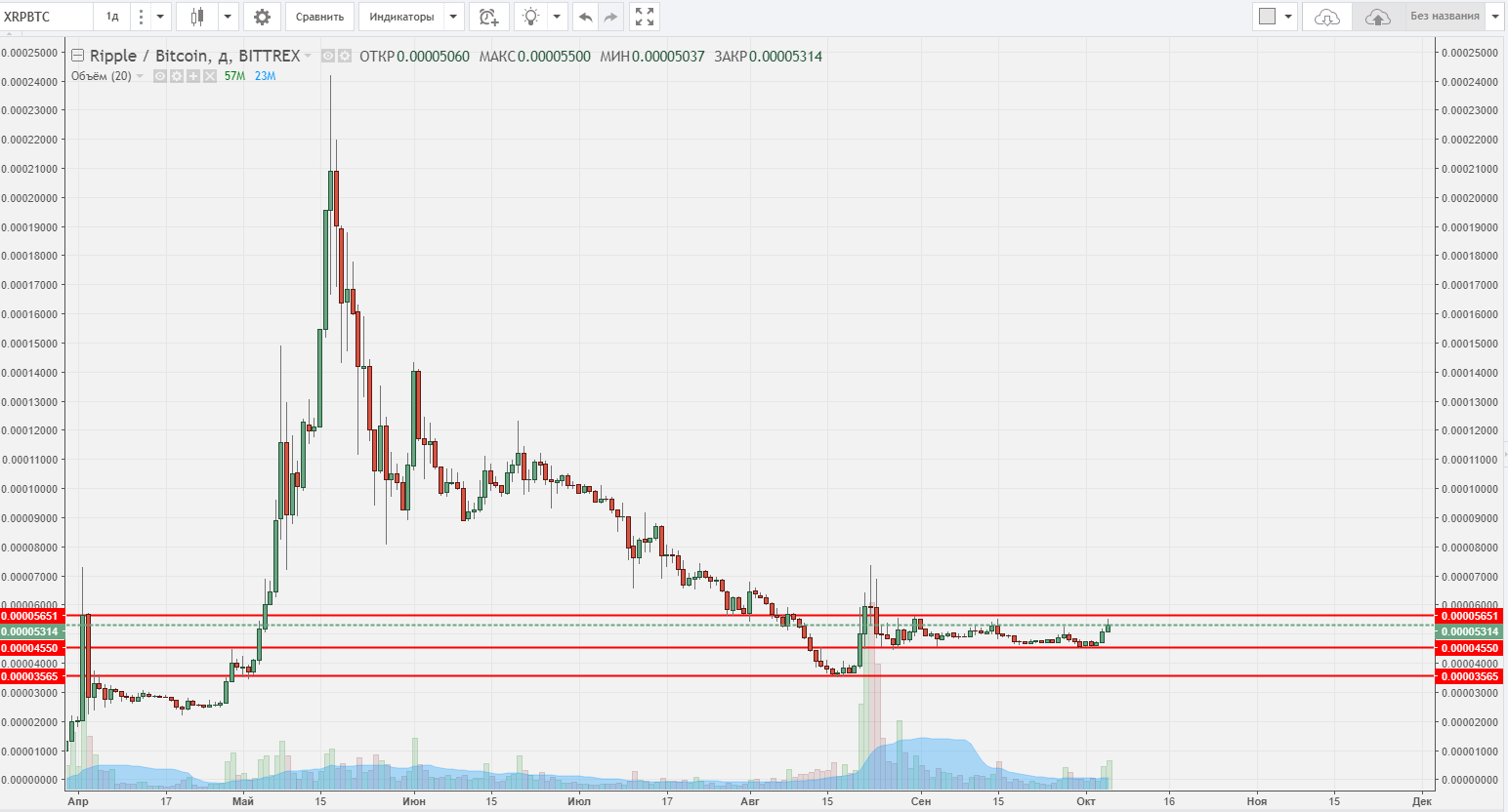 Ситуация в торговой паре XRP/BTC во многом схожая. Интересным моментом является локальный рост актива, невзирая на восстанавливающийся биткоин.