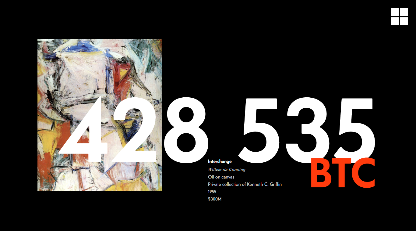 Возьмем для примера самую дорогую картину «Interchange» Виллема де Кунинга, которую в ноябре 2015 продали на аукционе за более чем $300 млн. Если перевести эти деньги в биткоин, то мы получаем примерно 428 535 BTC. Мне очень понравился такой контраст и я решил показать его в виде некой галереи и для других картин подобного ценового сегмента.