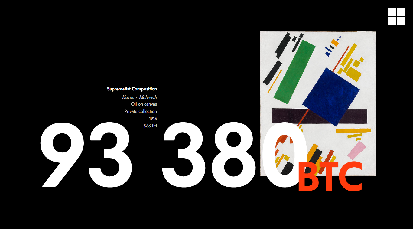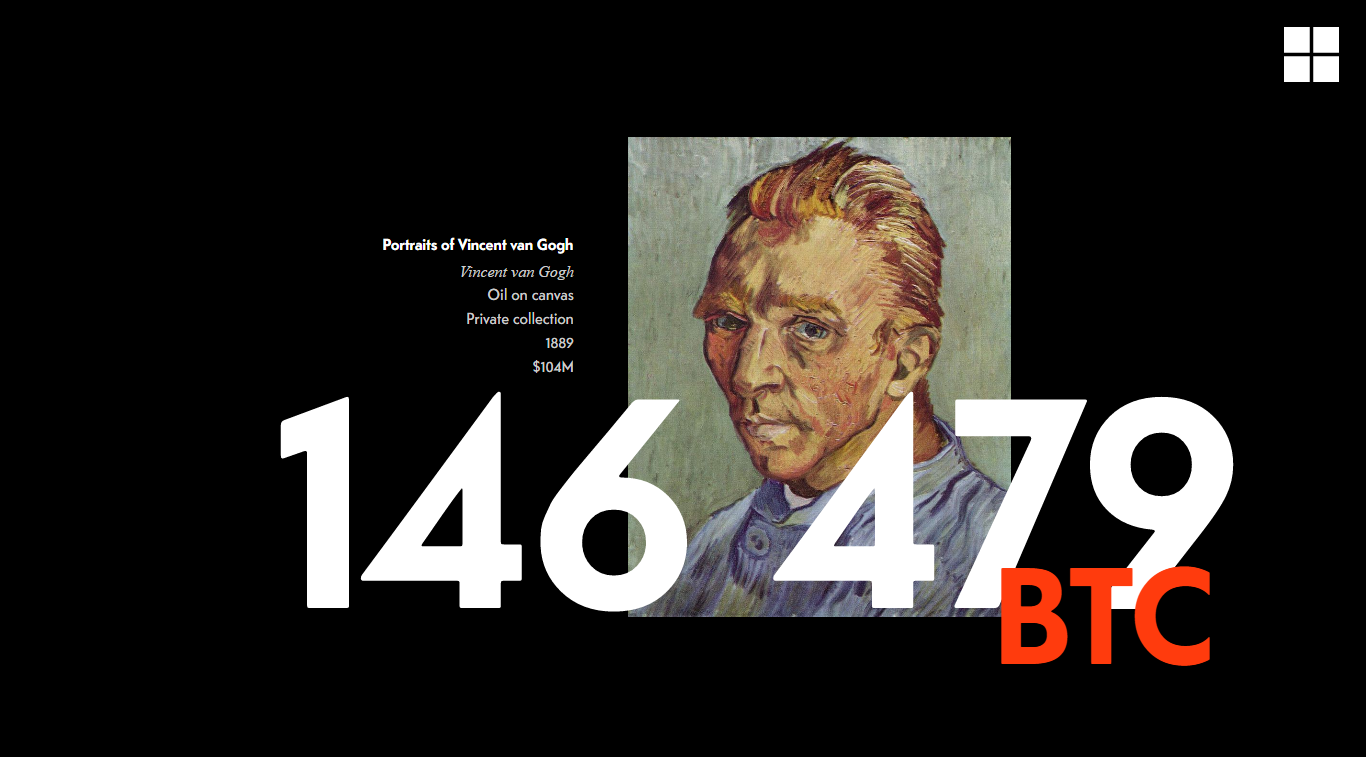 Если же говорить о целях проекта ArtforBitcoin.Gallery, то это в первую очередь информационный арт-проект и инфографика, сравнивающая последнюю известную в открытых источниках цену продажи картин, конвертированную в биткоин по курсу $710 (цена доллара за биткоин на момент создания проекта).