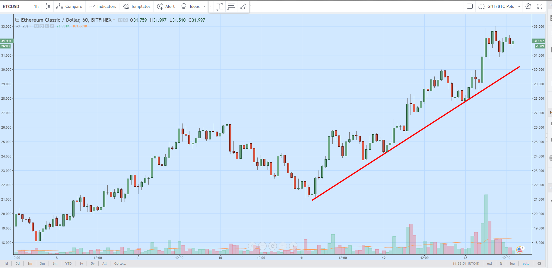 Если положительный тренд подтверждается еще и ростом объемов торгов (индикатор Volume в виде зеленых и красных столбиков), то это свидетельствует об устойчивости тенденции и, в частности, о том что спрос все больше преобладает над предложением, невзирая на дальнейший рост цены. Пробитие линии восходящего тренда вниз (особенно если красная свеча формируется на фоне роста объема торгов) будет сигнализировать о высокой вероятности перелома тенденции и ее разворота.