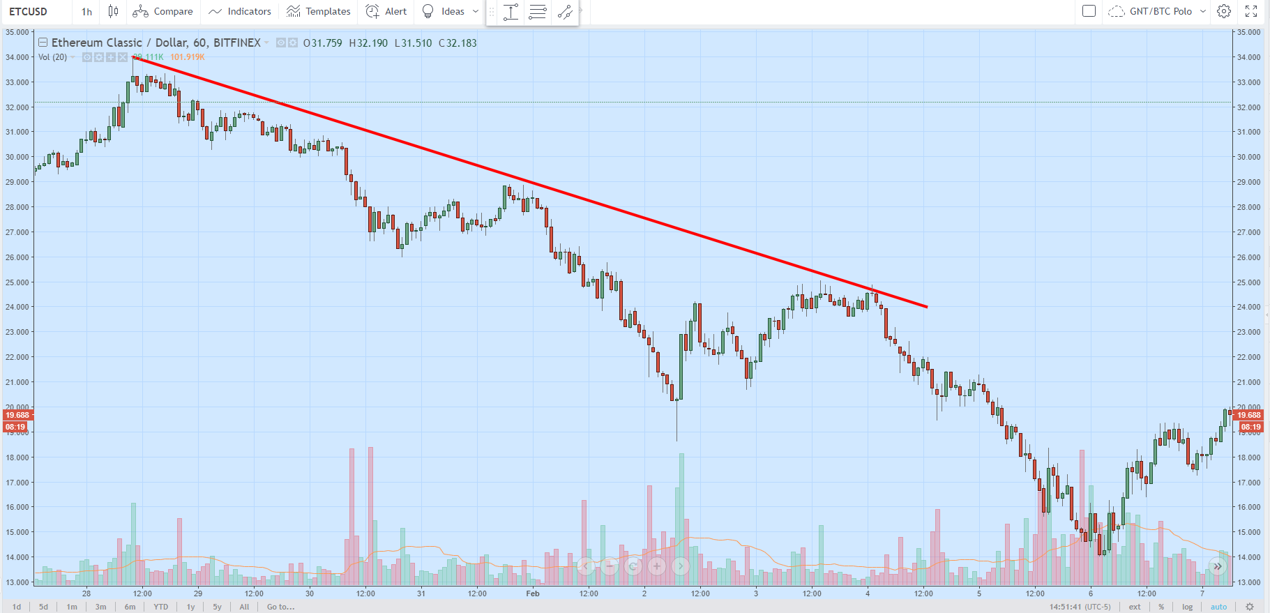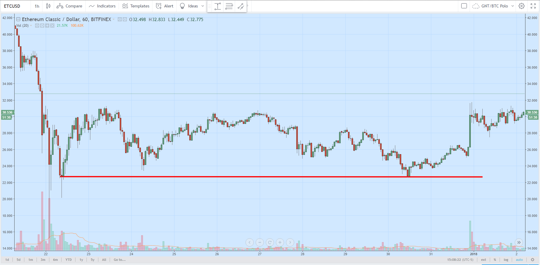 Ниже на часовом графике ETC/USD виден явный «боковик», однако цена колеблется в рамках относительно широкого диапазона ($22-30).