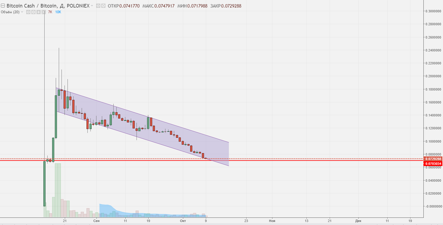 Нисходящий ценовой канал на дневном графике BCH/BTC (конец августа-октябрь 2017 года)