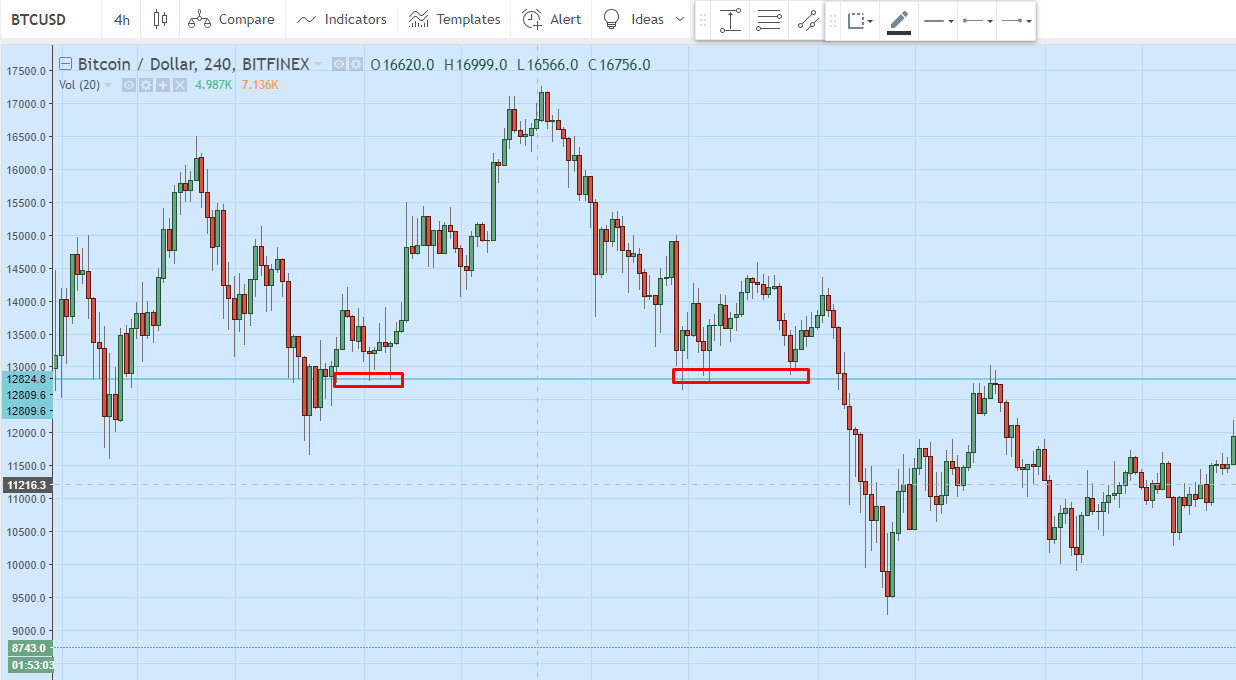 После пробития уровень поддержки становится сопротивлением, и наоборот. На графике видно, как это происходит после пробития вниз уровня в районе $12 824. Спустя какое-то время цена также периодически пытается пробить этот уровень, однако уже снизу-вверх.
