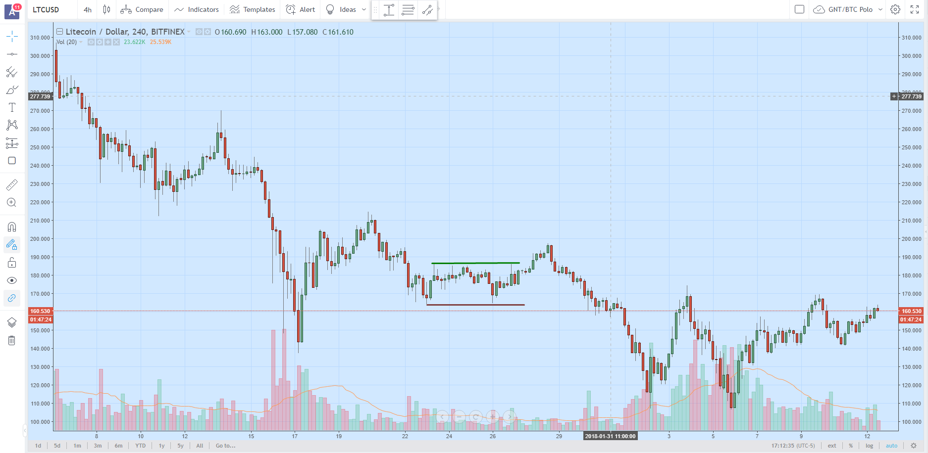 Четырехчасовой график BTC/USD в начале декабря 2017 года. Область поддержки прослеживается у отметки $13 000.