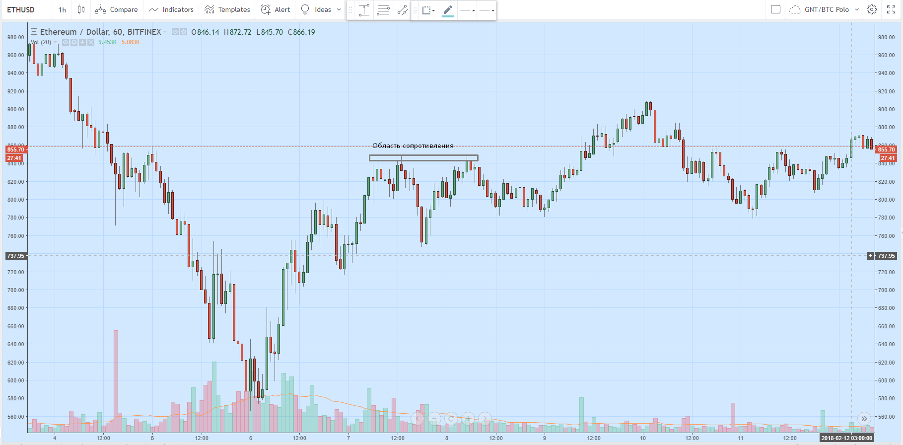 Как видно из графика ETH/USD, цена может встречать сопротивление не обязательно в одном и том же месте, а в неком диапазоне, который называется областью сопротивления. В этом относительно узком диапазоне «показывают свой характер» продавцы, препятствуя восходящему движению цены.