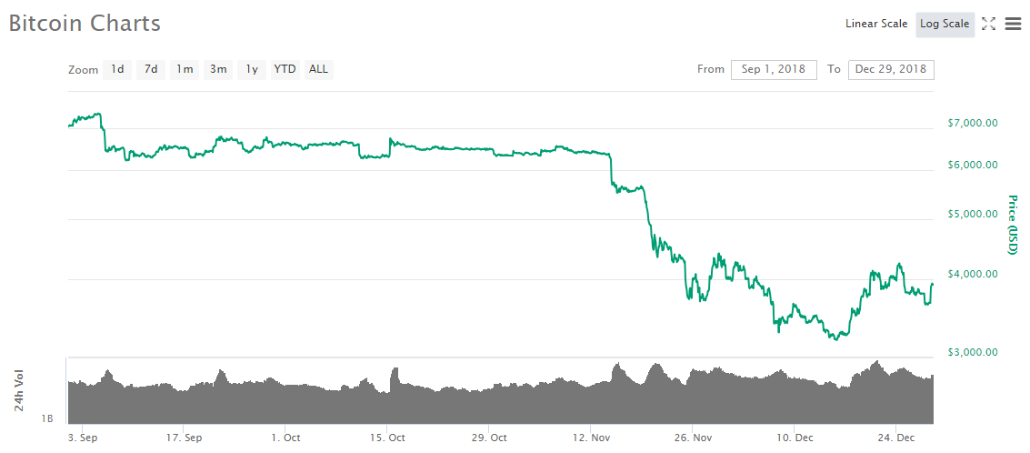 С этой точки рынок продемонстрировал небольшое восстановление, однако преодолеть сопротивление выше $4200 биткоин так и не смог. По состоянию на 29 декабря первая криптовалюта торговалась в районе $4000.