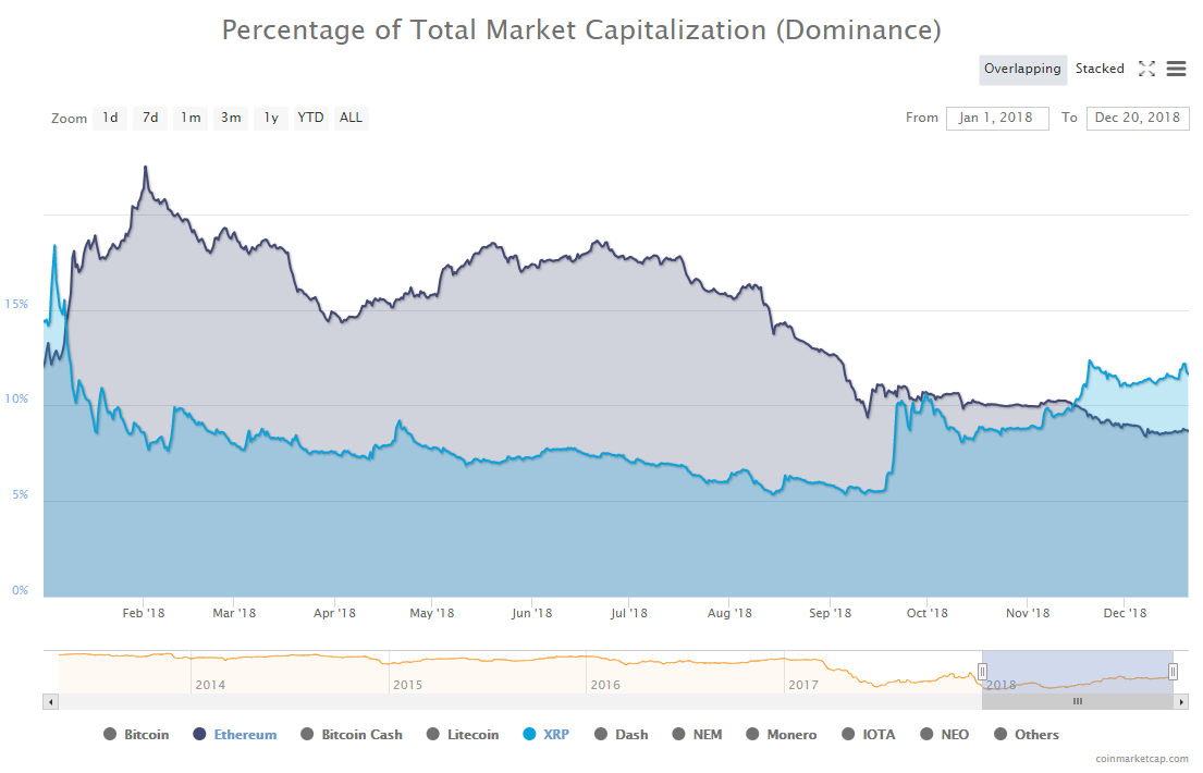 Более того, чуть позже с Ethereum случился тот самый flippening, о котором так много говорили в 2017 году. Правда, это не эфир обошел по капитализации биткоин, а он сам уступил второе место в рейтинге CoinMarketCap, которое теперь занимает монета XRP.