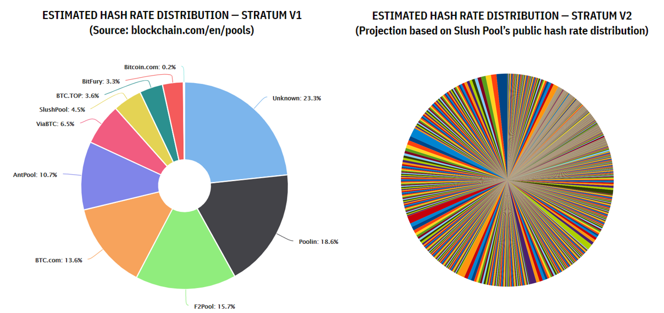 На графике ниже, взятом из презентации Мэтта Коралло о централизации консенсуса, показано, как именно Stratum V2 меняет распределение хешрейта в сети биткоина.