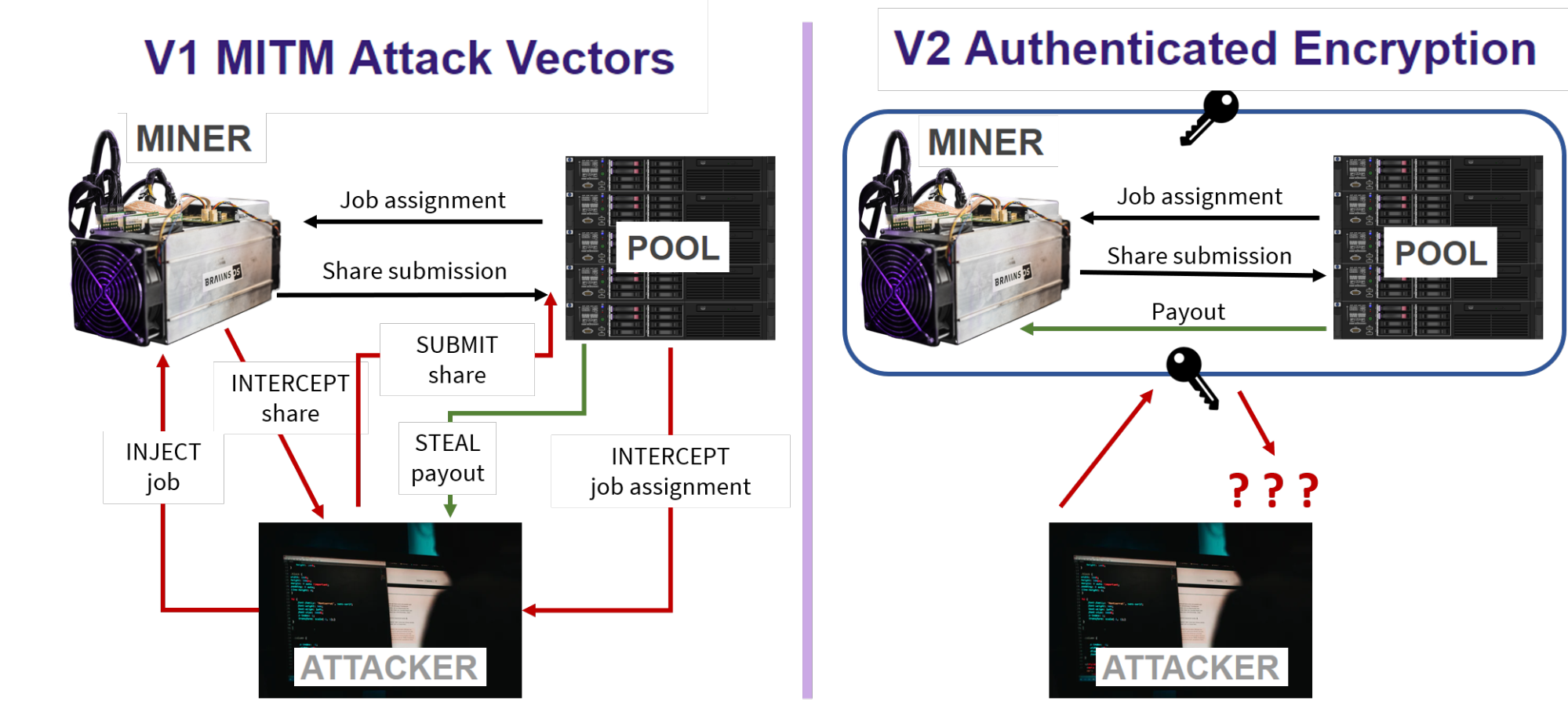 В оригинальной версии Stratum злоумышленник может изменить рабочую задачу еще до того, как она дойдет до майнера, а затем перехватить работу, когда тот пытается ее предоставить, и все это без ведома пула или майнера! Такая атака также известна как «хайджекинг хешрейта», и Stratum V2 ее предотвращает.