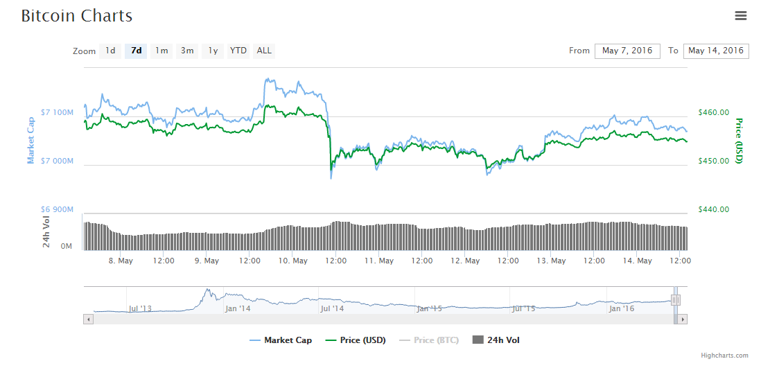 Минувшая неделя выдалась для биткоина достаточно спокойной, и цена криптовалюты на фоне сравнительно небольших объёмов торгов на биржах стабилизировалась в промежутке между $450 и $460.