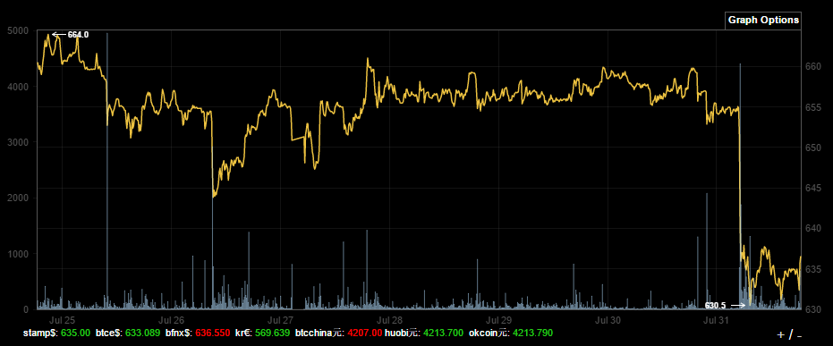 В ночь на последний день июля биткоин, однако, резко пошел вниз, добравшись в какой-то момент до $630, и в течение сегодняшнего дня выше $637 подняться пока не смог.