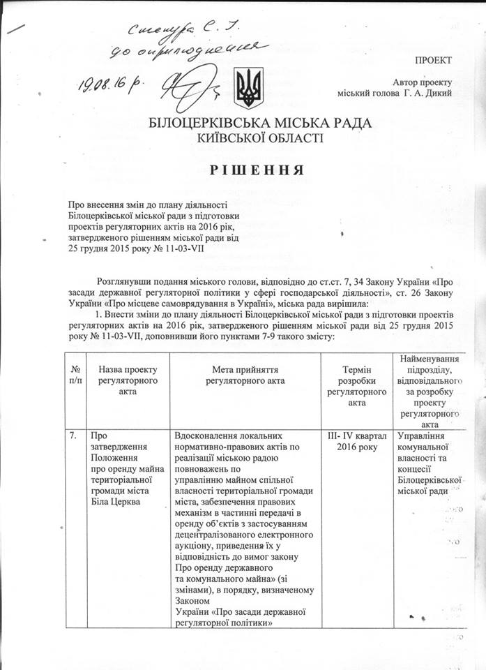 Об этом говорится в решении «О внесении изменений в план деятельности Белоцерковского городского совета при подготовке проектов регулятивных актов на 2016 год», утвержденном городским советом Белой Церкви.