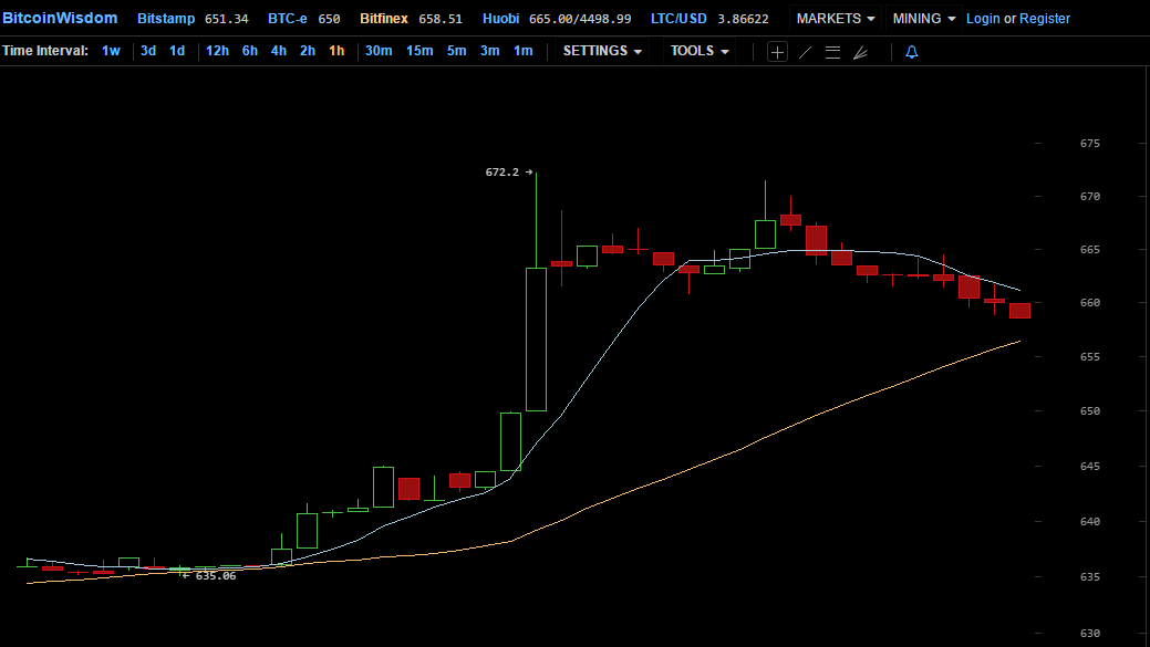 После неизбежной коррекции цена биткоина еще в тот же опустилась до $665 и продолжает небольшое снижение в первой половине дня воскресенья. По состоянию на 14:00 биткоин торгуется в районе $660 на Kraken и $658 на Bitfinex, чуть меньше предлагают на европейских и американских биржах: $651 на Bitstamp, $650 на BTC-e.