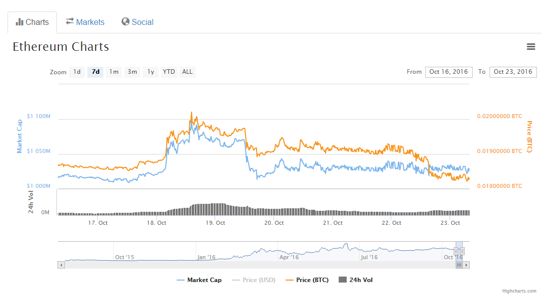 Также обратим внимание на курс ETH: поднявшись примерно на 10% на фоне хардофорка, он впоследствии пошел вниз и к воскресенью торгуется в районе 0.0182 BTC ($12.04). Рыночная капитализация Ethereum на сегодняшний день составляет $1,026 млрд.
