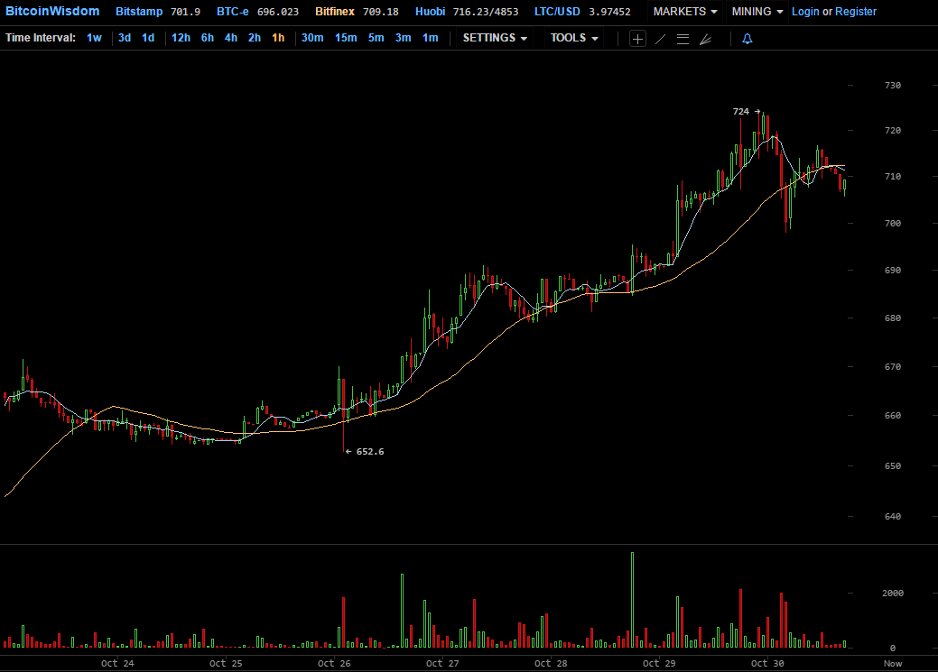 Первая волна роста курса случилась в среду, 26 октября, когда на ряде бирж криптовалюта поднялась выше $680. В последующие несколько дней биткоин продолжал демонстрировать тренд на повышение, добравшись к вечеру пятницы почти до $695.