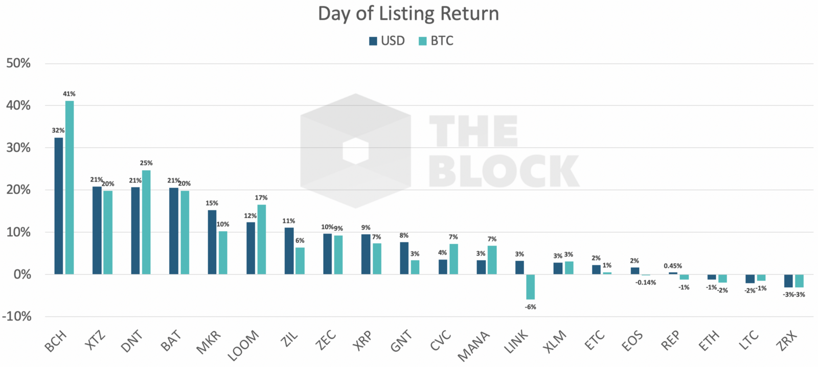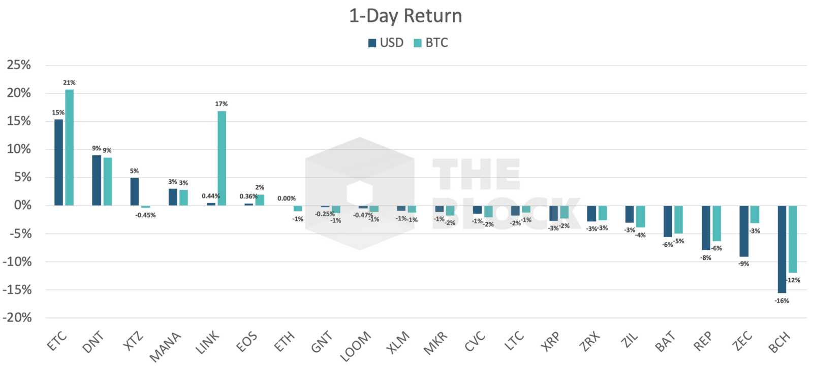 «Мы обнаружили, что за этот период времени актив рос в среднем на 9% в долларовом выражении и на 8% по отношению к BTC. Медианное значение показателя с USD и BTC составило 6% и 7% соответственно. 14 из 19 проанализированных нами активов продемонстрировали положительную динамику».