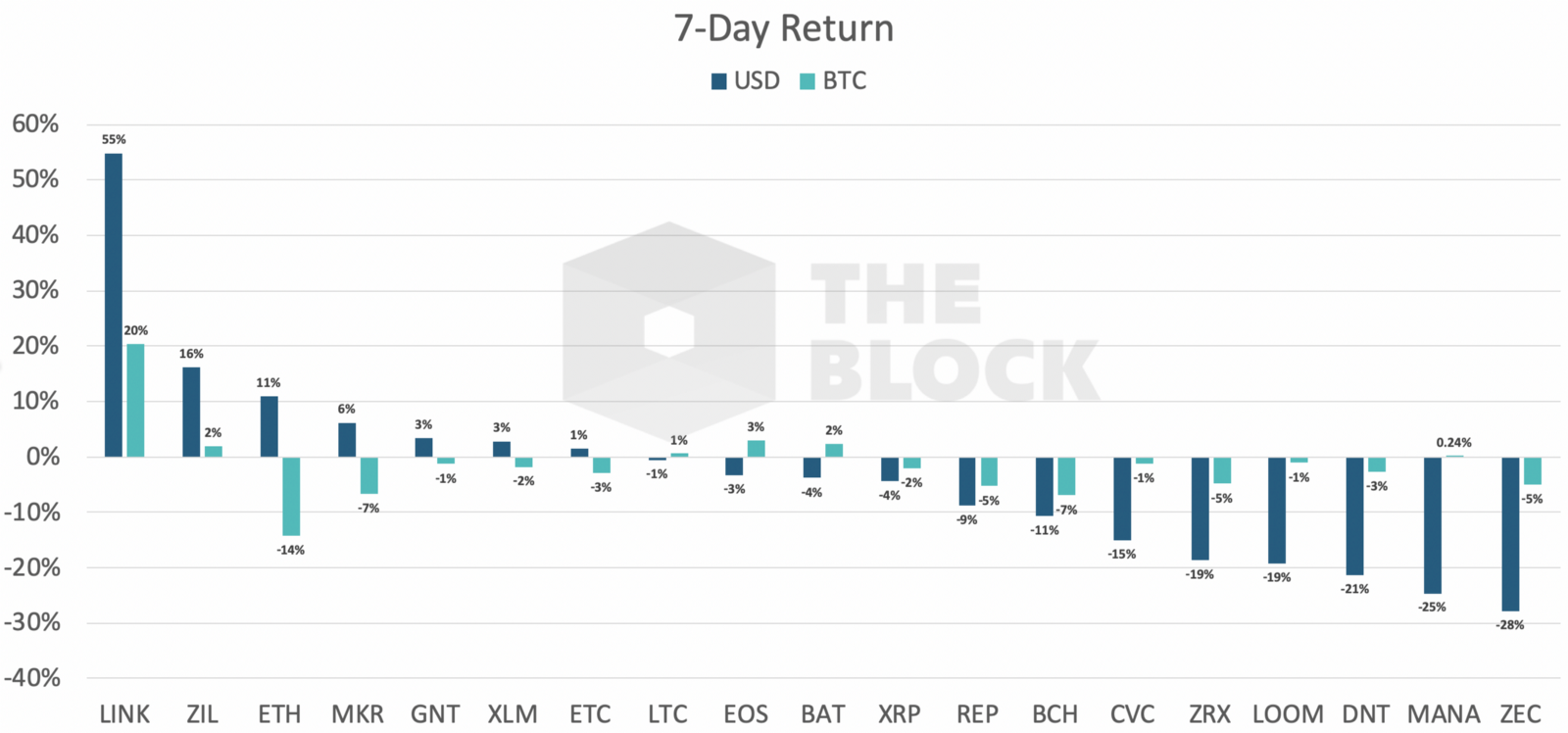 За неделю средняя величина просадки к USD составила -3%, к BTC — -1%, медианные значения — -4% и -2% соответственно. Лишь 2 из 19 активов показали положительную динамику в течение этого промежутка времени. Наиболее впечатляющий рост продемонстрировал Chainlink.