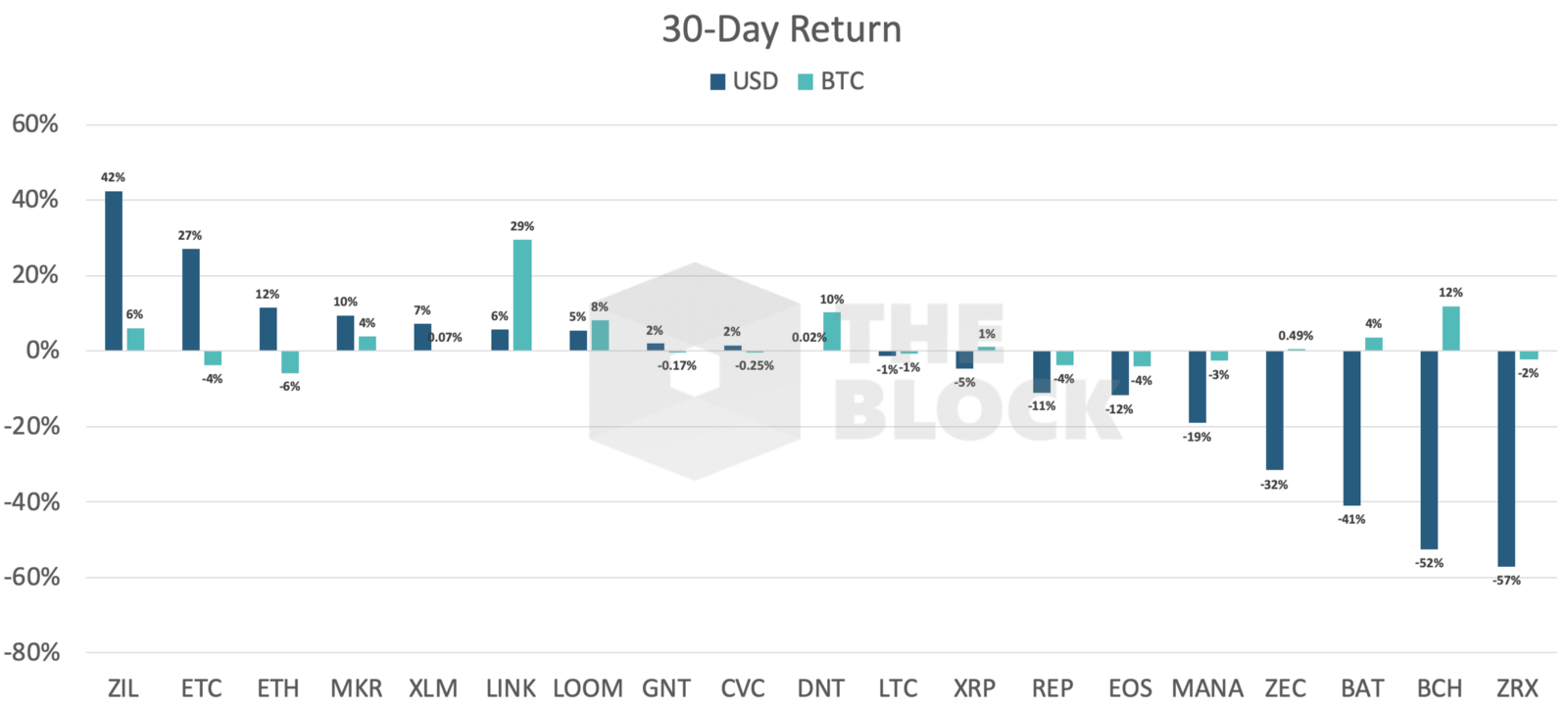 5 из 19 активов продемонстрировали положительную динамику по отношению к доллару и биткоину. Наибольший рост за этот период показала Zilliqa, которая не особо блистала в течение суток после листинга.