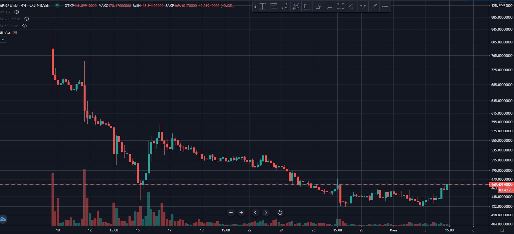 Сразу после начала торгов цена токена MKR начала стремительное падение.