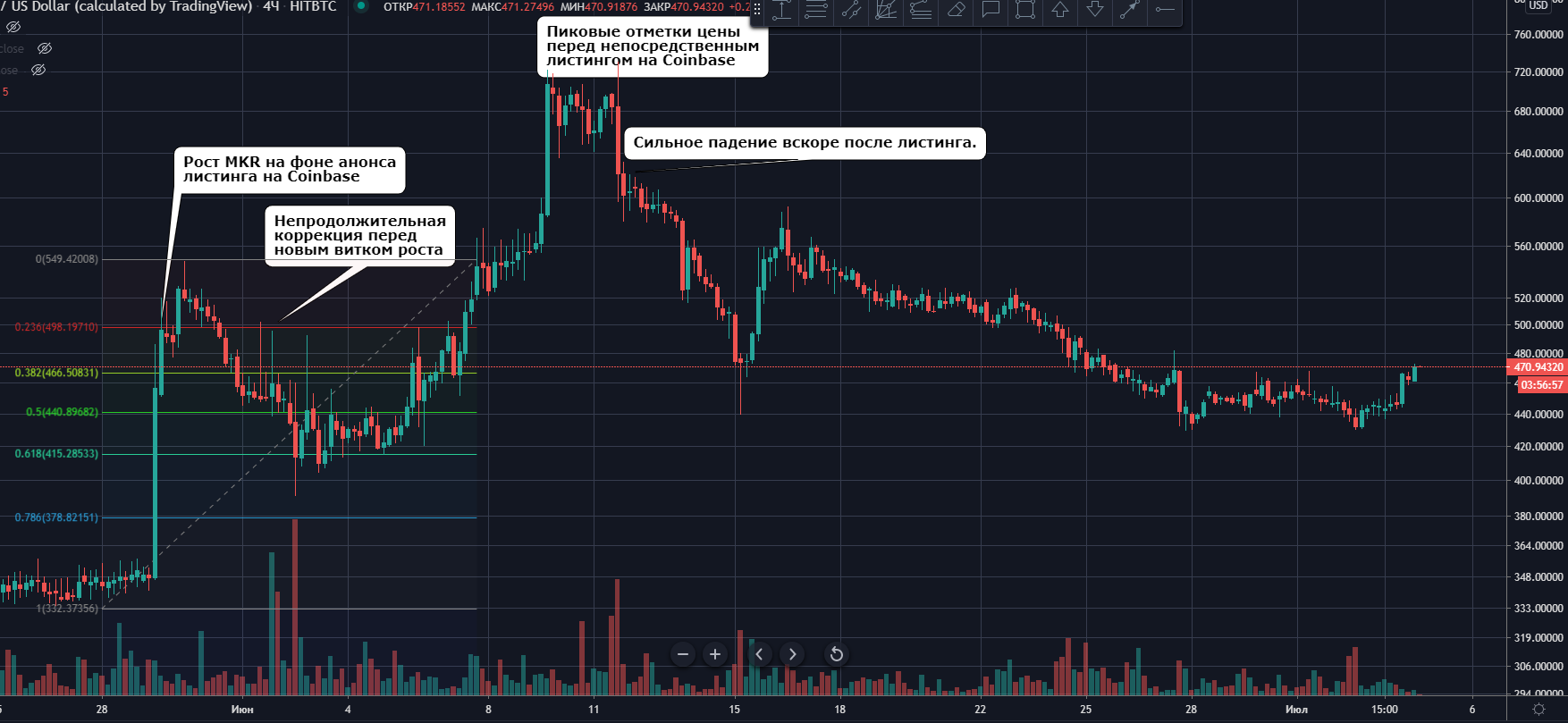 29 мая, на фоне объявления Coinbase о листинге MKR, его цена всего за час подскочила примерно на 40% — с $349 до $478 за монету.