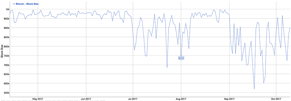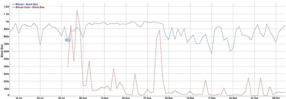 Интересно увидеть и ситуацию с заполняемостью блока в недавно появившемся Bitcoin Cash, сторонники которого отделились прежде всего из-за принципиально иного взгляда на то, как должен развиваться биткоин.