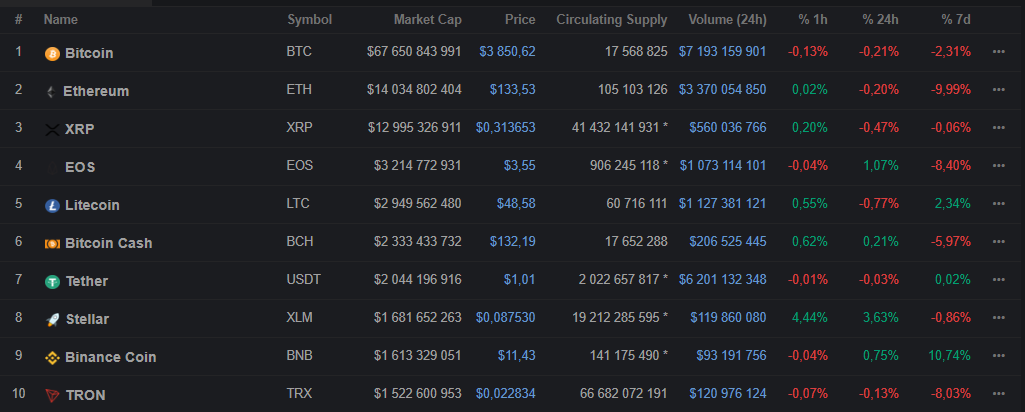 Словно подражая биткоину, на протяжении недели не особо колебались цены большинства остальных представителей первой десятки криптовалют: