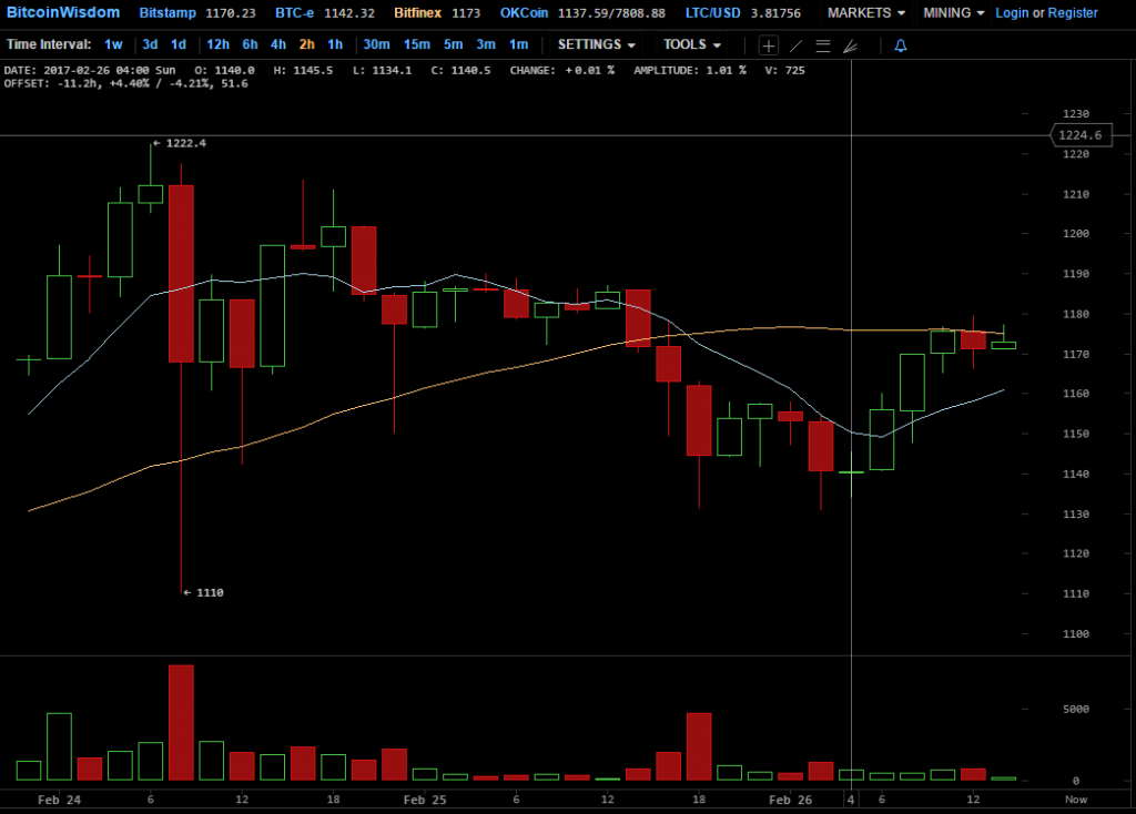 Рекордная цена, впрочем, продержалась недолго: уже утром в пятницу курс обвалился более чем на $100, вернувшись после этого в коридор между $1150 — $1180. Неопределенность на рынке можно было наблюдать и в течение субботы и первой половины воскресенья – так, в ночь на 26 февраля цена биткоина опускалась до $1130. На момент публикации (13:30 GMT) средневзвешенная цена криптовалюты составляет $1170.