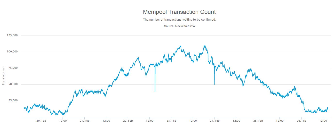 Как бы то ни было, рекорд уже вписан в историю, при этом выходу первой криптовалюты на новые высоты не помешало и то, что незадолго перед этим мемпул сети оказался забит неподтвержденными транзакциями. Рекордный показатель в 108715 транзакций был зафиксирован 23 февраля, однако к концу недели кривая графика уверенно пошла вниз.