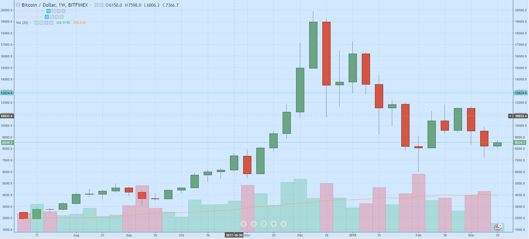 Впрочем, в конце прошлого года и на рынке криптовалют были налицо некоторые признаки пузыря. К примеру, на недельном графике биткоина можно легко увидеть, как в последние месяцы прошлого года цена первой криптовалюты еженедельно росла на 20-30%, привлекая на рынок все больше участников.