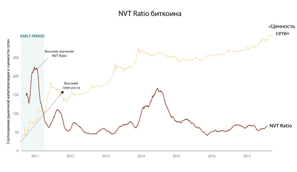 На графике ниже видно, что на заре становления биткоина значения индикатора NVT были крайне высокими, поскольку капитализация рынка была несопоставимо выше объема транзакционного спроса на «цифровое золото».