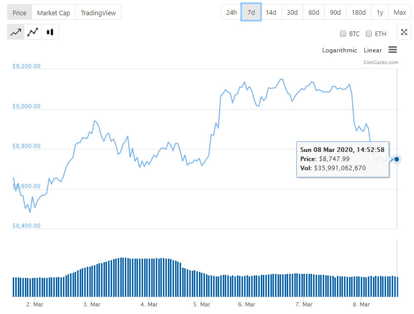 За прошедшую неделю первая криптовалюта успела вернуться к котировкам выше уровня $9000, ниже которого оказалась с 20 февраля. Это произошло в четверг, 5 марта, но уже в субботу вечером цена биткоина снова опустилась ниже психологической отметки.