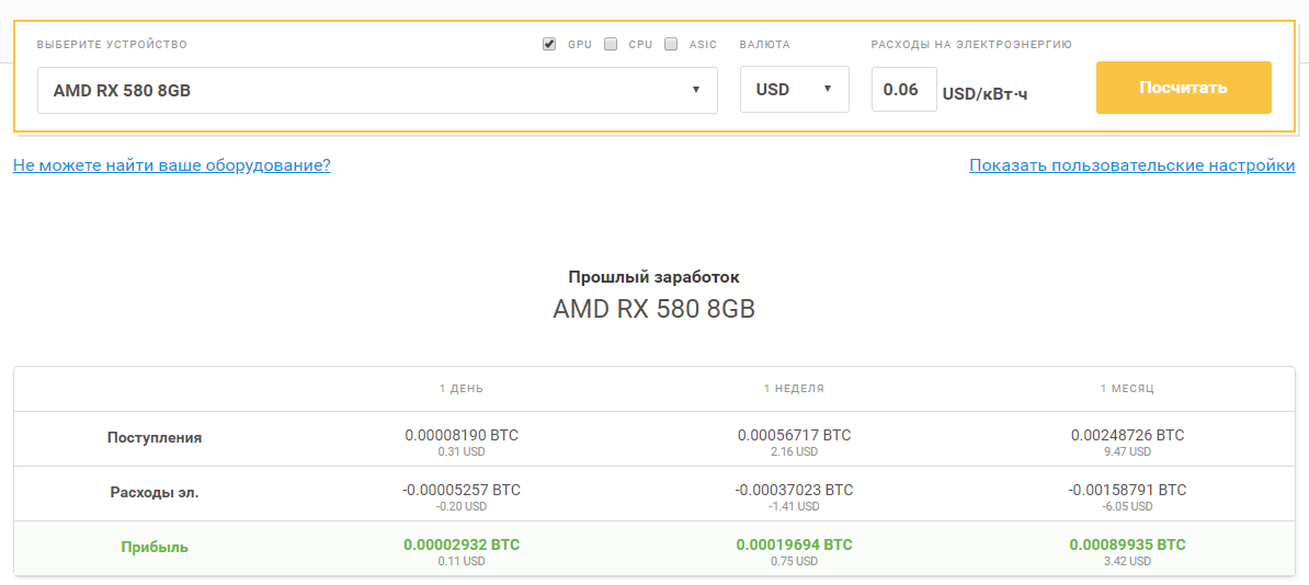 Например, если верить калькулятору от Nicehash, то даже при $0.06 за кВт⋅ч популярная среди майнеров видеокарта AMD RX 580 8 GB приносит в месяц $3,42.