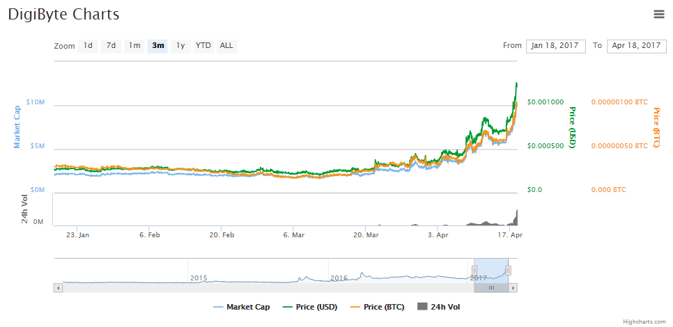 В результате активация SegWit цена DigiByte за последние несколько дней выросла более чем на 50%, а сама монета поднялась 54-е место в списке криптовалют с капитализацией почти в $10 млн.
