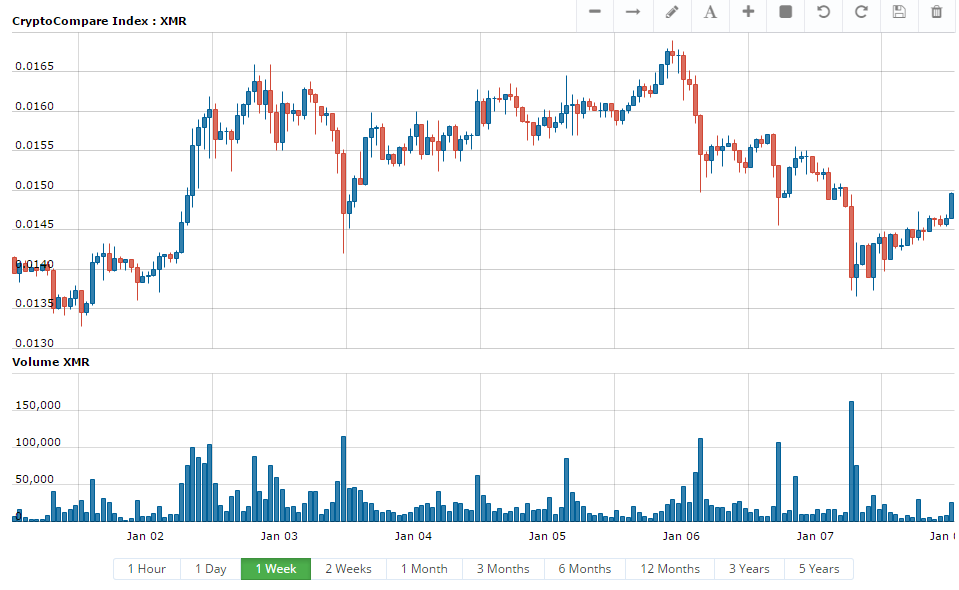Новость о добавлении Monero на Kraken стимулировала существенный рост токена – на какое-то время XMR даже вышел на третье место по рыночной капитализации, опередив Ripple Litecoin, в то время как его цена поднималась до 0.0167 BTC. И хотя закрепиться на набранных высотах Monero не удалось, по итогам первой недели года стоимость монеты выросла почти на 6%.