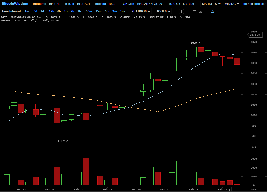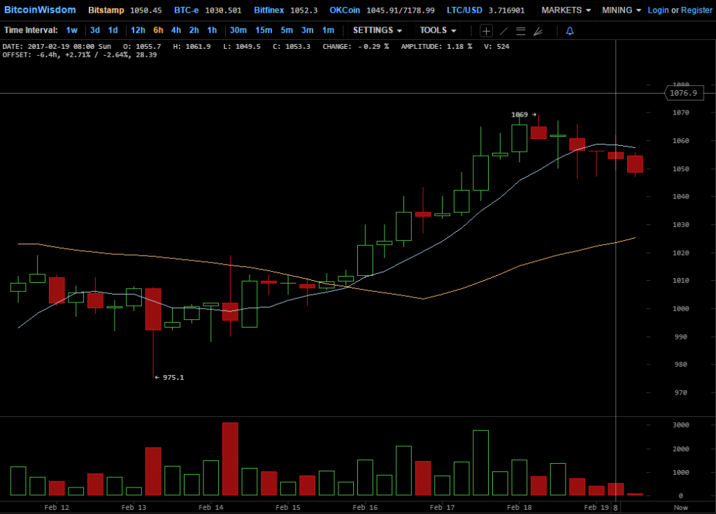 Эта неделя стала первой в 2017 году, когда цена биткоина, за исключением коротких отрезков времени при колебаниях курса, продержалась на отметках выше $1000. Последние два дня криптовалюта при этом торгуется выше $1050, который, видимо, и можно считать новым уровнем поддержи на краткосрочную перспективу.