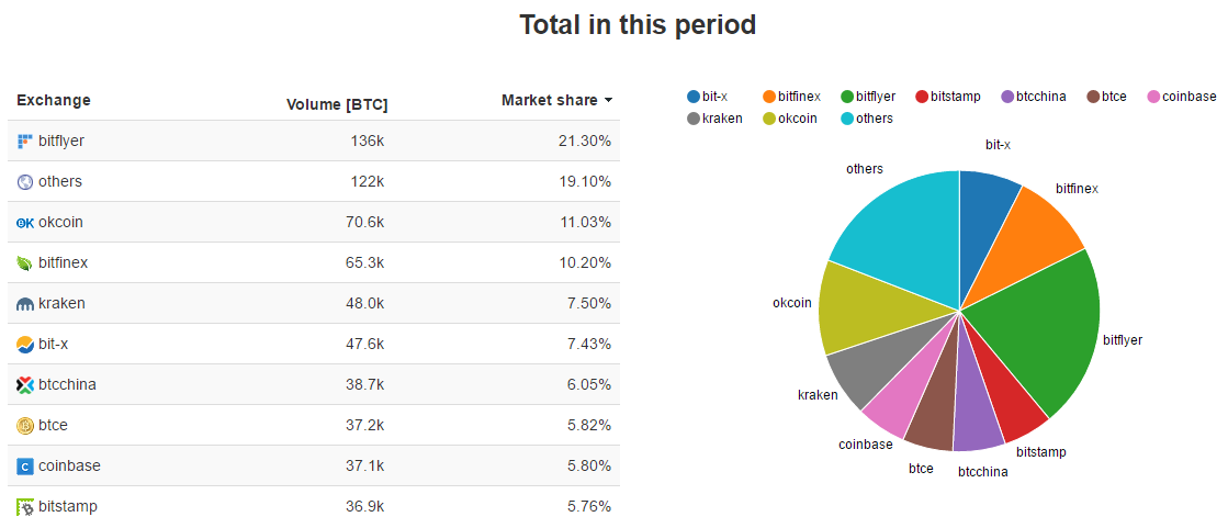 При этом все отчетливее вырисовывается картина, в которой месту тотальному доминированию китайских бирж уже нет. Так, по данным Bitcoincity, лидером по объему торгов за эту неделю стала японская BitFlyer, также в тройку лидеров вошли OkCoin и Bitfinex.