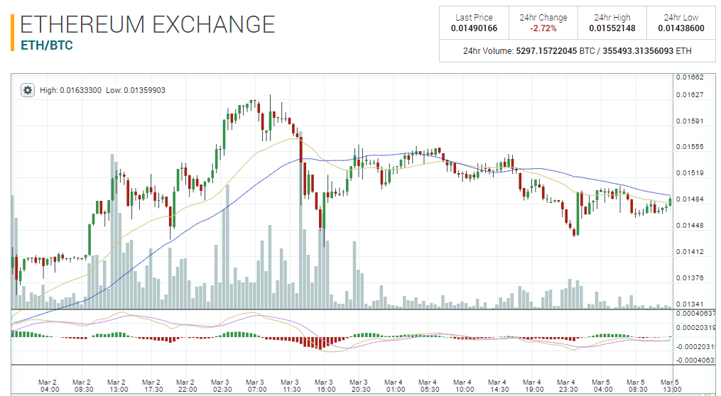Новость о создании EEA также помогла Ethereum вырасти в цене на биржах. В ночь на пятницу курс криптовалюты поднимался до 0.016 BTC (более $20), но к воскресенью, как и Dash, она опустилась в цене до 0.0148 BTC.