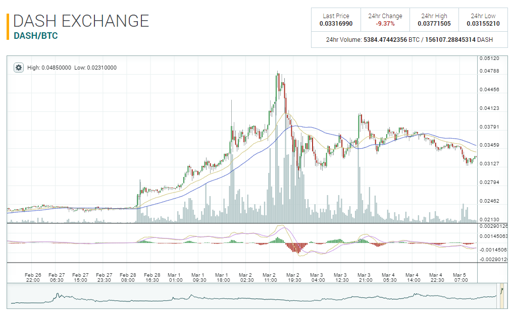 Абсолютный ценовой рекорд был зафиксирован утром в четверг, 2 марта, когда криптовалюта торговалась за 0.0479 BTC (около $60 за монету по текущему курсу). Однако уже к вечеру того же дня криптовалюта подешевела до 0.031 BTC. В последующие дни Dash поднималась до 0.041 BTC, но к воскресенью снова опустилась до 0.033 BTC, подешевев за последние 24 часа примерно на 15%.