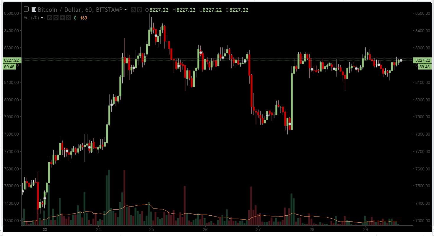 Падение, впрочем, оказалось не долгим: уже вечером в пятницу криптовалюта снова стремительно пошла вверх, быстро вернувшись к прежнему уровню в районе $8200, где с тех пор и остается, демонстрируя в целом здоровую волатильность в пределах ста с небольшим долларов вверх или вниз.