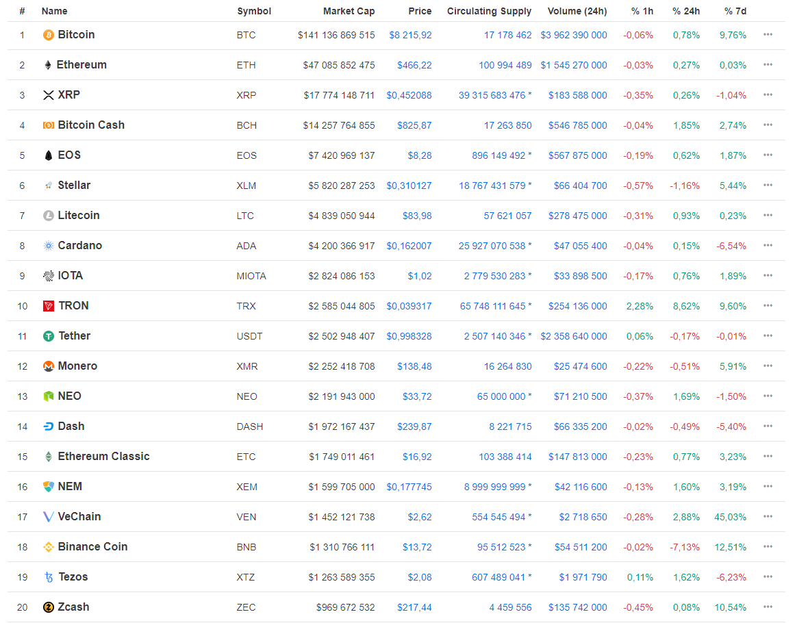 Среди Топ-20 цифровых активов наилучшие показатели на этой недели продемонстрировали VeChain (+45%), Binance Coin (+12,5%), Zcash (+10,5%), Tron (+9,6%) и Stellar (+5,4%).