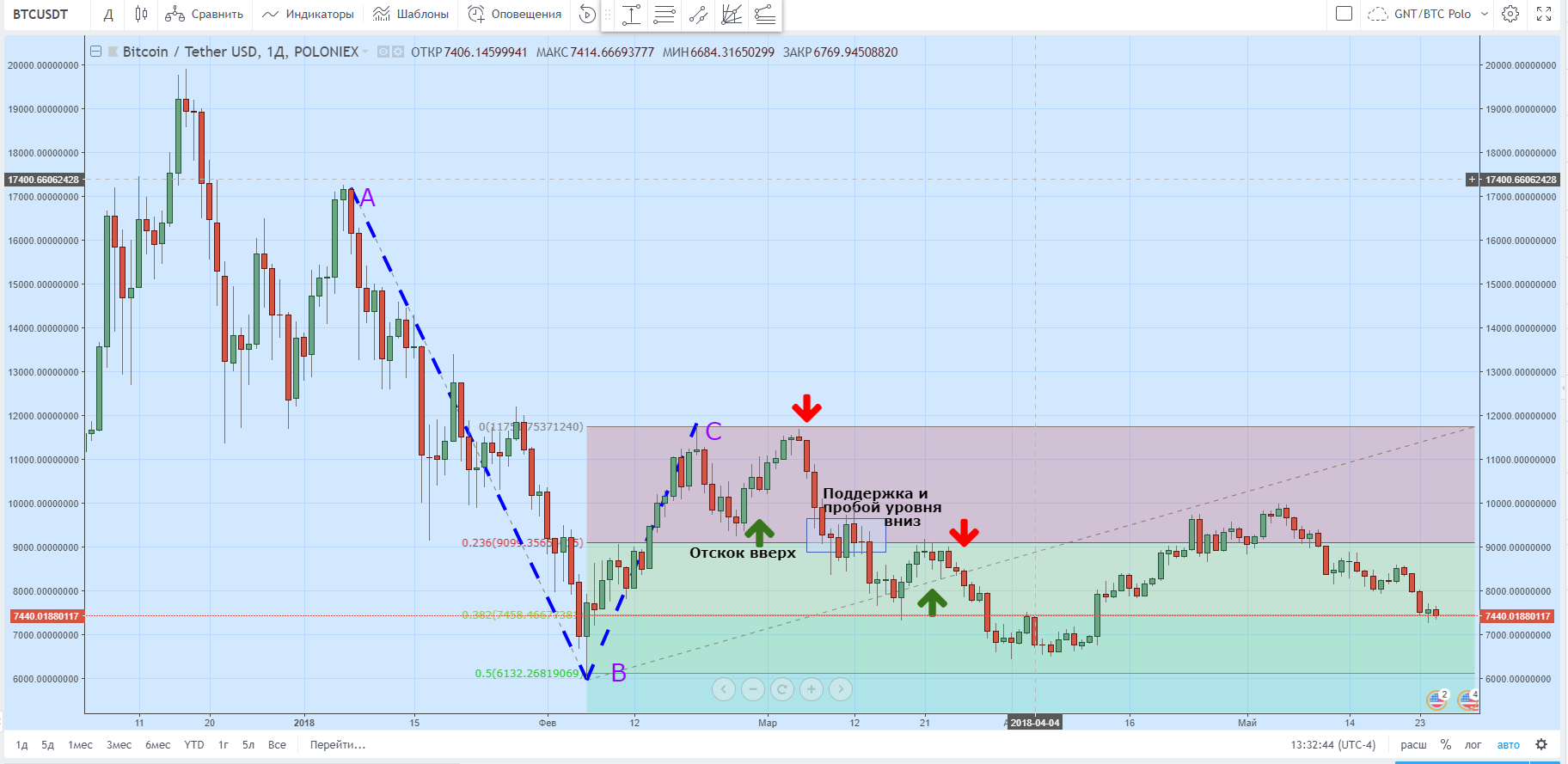 На графике заметно, как цена несколько раз отталкивалась от области у отметки 50%, которая некоторое время прослужила поддержкой. Затем этот уровень во второй половине января 2018 года был все же пробит, а медведи столкнулись с новым препятствием в районе 61,8% шкалы Фибоначчи. Последний также спустя некоторое время был пробит, превратившись в уровень сопротивления.
