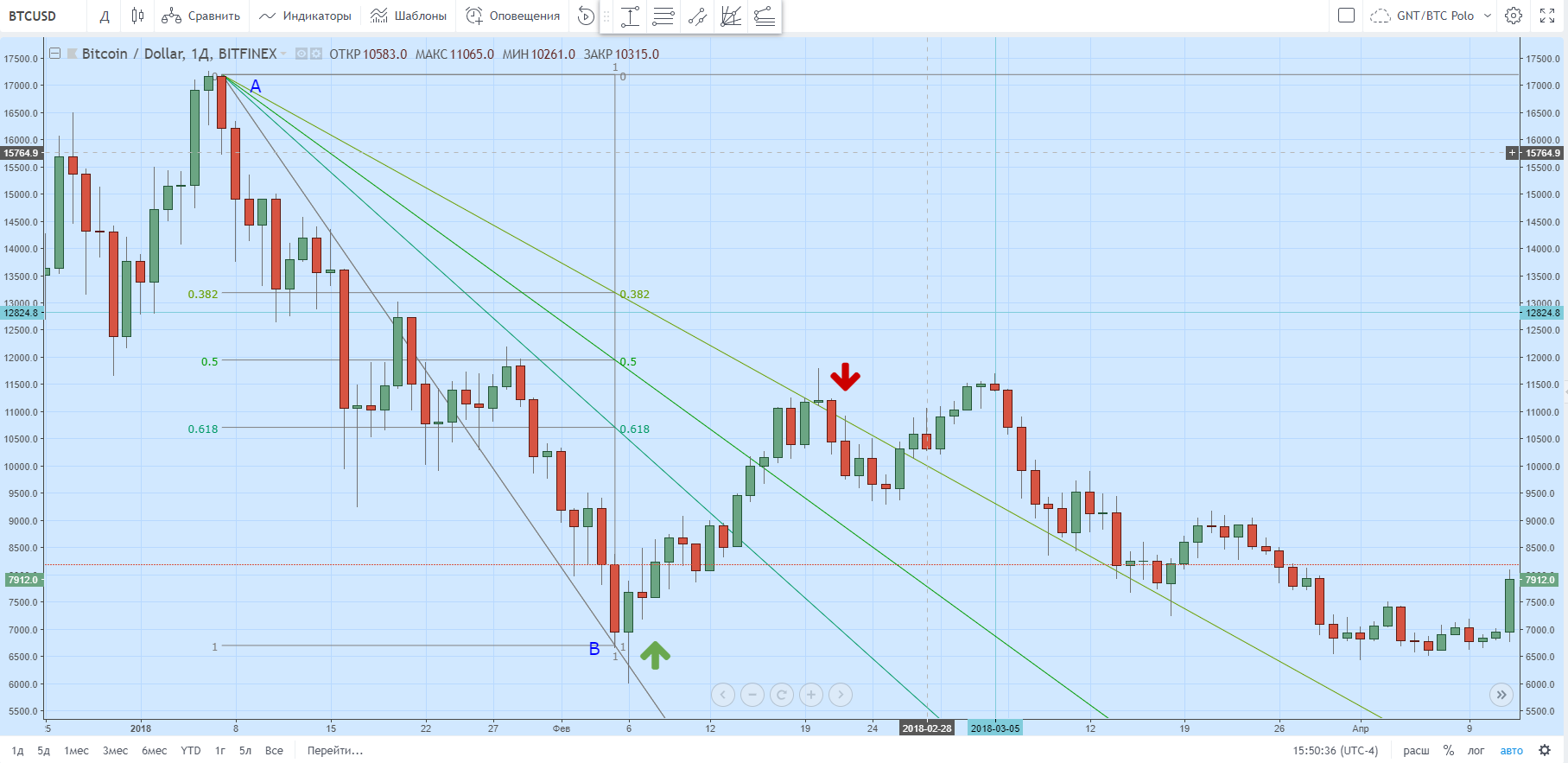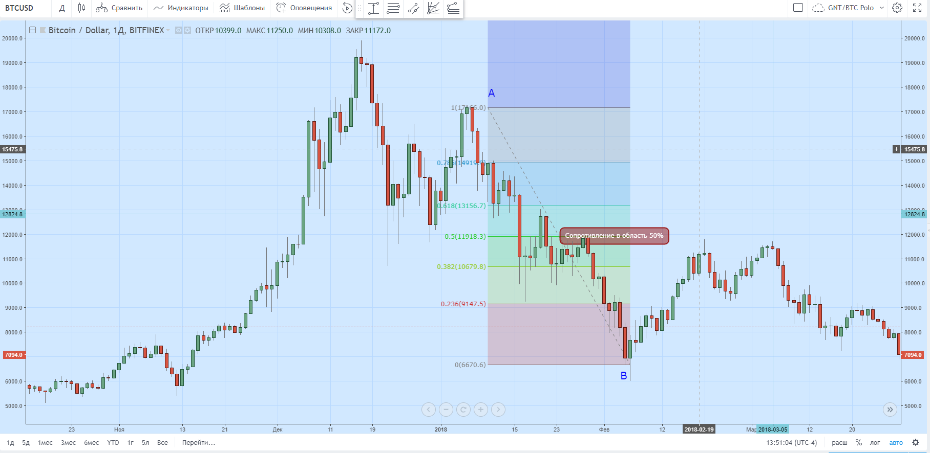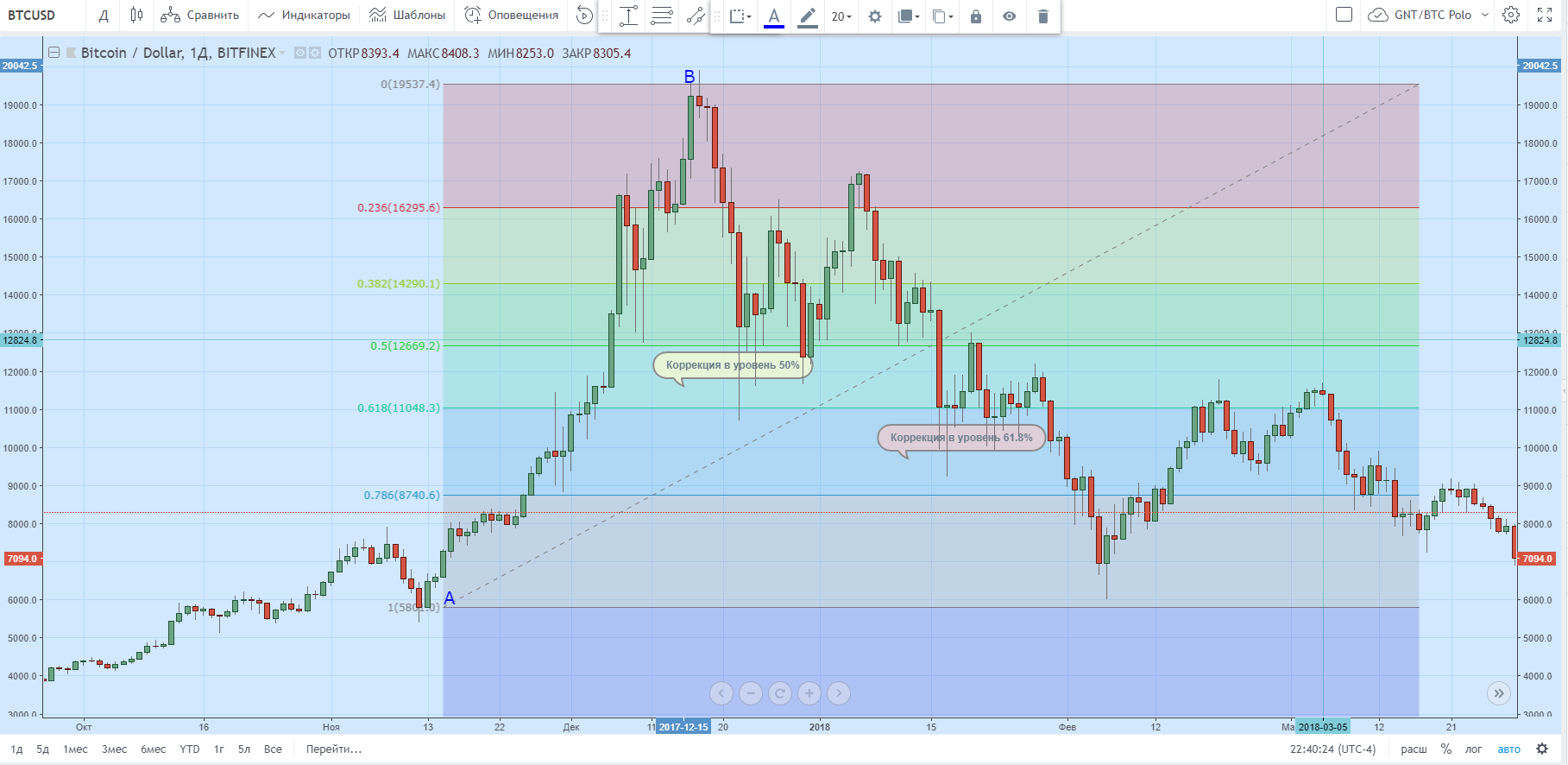 На рисунке ниже при помощи инструмента «Коррекция по Фибоначчи» платформы Trading View выстроены соответствующие уровни. В качестве исходной точки (А) было выбрано начало восходящего тренда; в роли конечной (B) — его завершение.