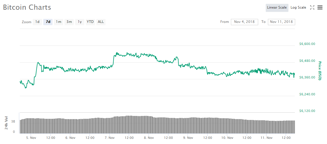 Средневзвешенный курс биткоина, поднявшись в среду, 7 ноября, до $6540, в дальнейшем пошел на снижение, и на момент публикации находится в районе $6400, рыночная капитализация оценивается в $111 млрд.