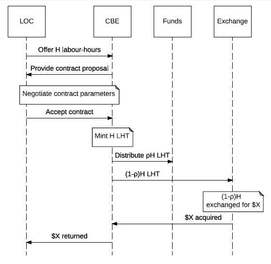 Если LOC не желает иметь дело с криптовалютами, то (1 — р)Н LH-токенов, выпущенных под его обязательства, направляются на биржу и продаются за фиатную валюту, которую CBE затем передает LOC.