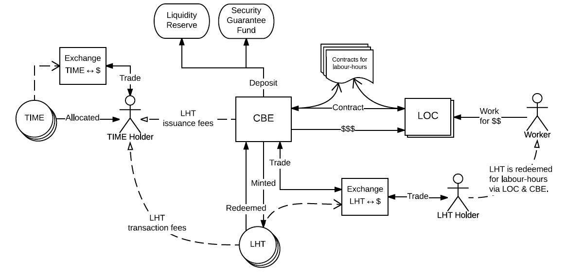 Как и в проектах Tether и Digix, в системе ChronoBank существует центральный орган, ChronoBank Entity или CBE, который координирует эмиссию, погашение и уничтожение LHT. На схеме ниже изображены основные действующие лица системы ChronoBank. Кроме CBE, это компании, которые предлагают рабочую силу (Labour-Offering Companies или LOC), и обязуются погашать LHT рабочей силой, биржи, на которых LHT обмениваются на фиатные валюты, а также держатели TIME-токенов и LHT.